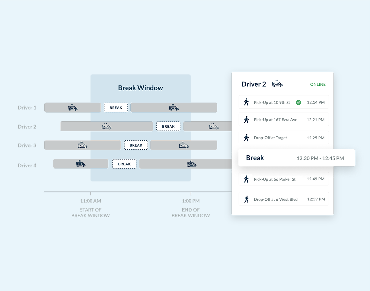 Scheduling teams can automate break management using Dynamic Breaks through ÌÇÐÄvlgoÍøÒ³°æâ€™s paratransit scheduling software. Driver breaks and lunches are optimized through Solver, and placed into itineraries where breaks are scheduled in locations with access to the appropriate facilities. With demand-response programs where trip patterns vary day to day, Dynamic Breaks helps schedulers manage breaks within ever-changing itineraries, ensuring compliance with union and requirements while prioritizing vehicle productivity.